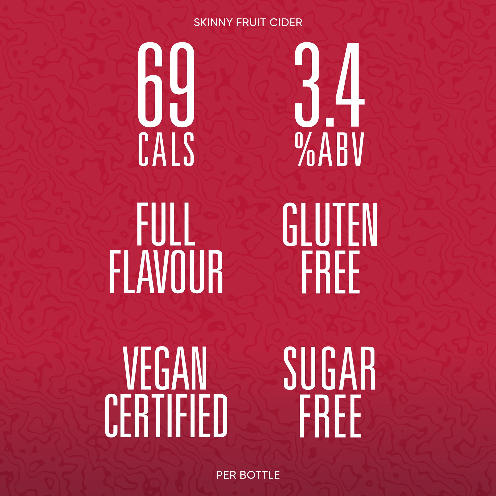 Skinny Fruit Cider has 60% fewer calories and 100% less sugar than other fruit ciders. Check out the table below to see how Skinny compares to other fruit ciders.